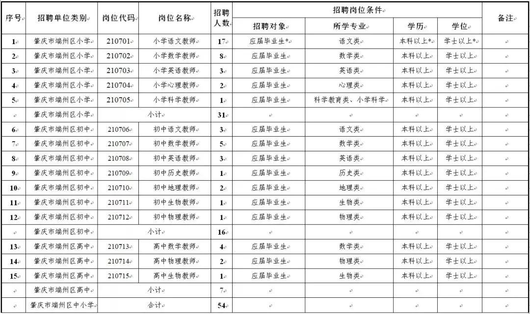 本次中小學(xué)教職員招聘人數(shù)為54人,具體崗位見(jiàn)公告附件1“肇慶市端州區(qū)教育局2021年第四批高校招聘中小學(xué)教職員崗位信息表”。